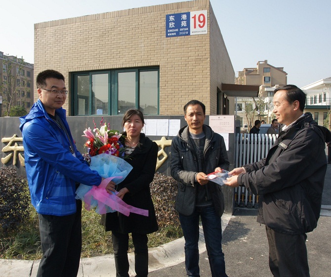 當(dāng)天上午8點(diǎn)38分,東港欣苑大門(mén)口,該鎮(zhèn)洋北村村民仲水根滿臉堆笑地從縣臨杭開(kāi)發(fā)區(qū)管委會(huì)副主任繆曉林手中接過(guò)了8幢301室的鑰匙,他身旁的妻子則從升華地產(chǎn)集團(tuán)雷甸項(xiàng)目負(fù)責(zé)人楊韓狄的手中接過(guò)了升華送出的賀喜鮮花,歡迎該小區(qū)第一位業(yè)主的到來(lái)。