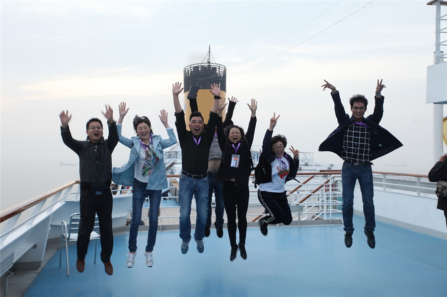 除了兩天時間登陸韓國濟州島與日本福岡短暫游覽之外,大部分時間是在郵輪上度過的。員工們站在海景船艙的陽臺上,任海風(fēng)吹拂著臉龐,不時有海鷗從眼前掠過。晴朗的早晨,登上郵輪頂上的甲板,看日出也是別有一番風(fēng)味。